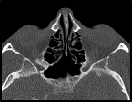 complications. In fact, a case of fibrous dysplasia has led to obliteration of the optic foramina causing bilateral blindness (13). Mucopyoceles have been described to cause bone erosion and cranial nerve palsy (14). Headache is often the initial symptom. Should it rapidly worsen or in case of persistence despite analgesics, then nasal endoscopy and head imaging are required (15,23). On the images, the sphenoid sinus should be carefully inspected for any anomaly. Indeed, sphenoid diseases may present without any nasal symptoms. Even more so, they might present at first with cranial nerve involvement. Then, the optic (II), the maxillary (V2) and the abducens nerve (VI) are most commonly involved (13).