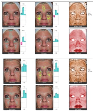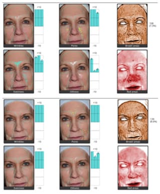 The Aging Skin population results were consistently favorable and increasingly positive with greater duration of use. Sixty percent of subjects noticed a decrease in visible wrinkles at 4 weeks, 68% by 8 weeks, and 84% by 12 weeks. Decreased pore size was reported by 45% of patients at 4 weeks, 55% of patients at 8 weeks, and 68% of patients at 12 weeks. An increase in skin tone was perceived by 72% of patients at 4 weeks, 80% by 8 weeks, and 83 % by 12 weeks. Textural improvement was reported by 68% of patients at 4 weeks, 83% at 8 weeks, and 88% at 12 weeks. Unwanted pigment variation was improved in 55% of patients at 4 weeks, 65% by 8 weeks, and by 78% of patients at 12 weeks. A decrease in skin oiliness was perceived by 72% of subjects at 4 weeks, 80% by 8 weeks, and 85% by 12 weeks. Unwanted vasculature such as telangiectasia or rosacea-related erythema was improved in 20% of patients at 4 weeks, 38% by 8 weeks, and 53% by 12 weeks.