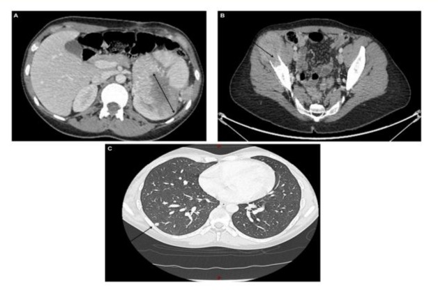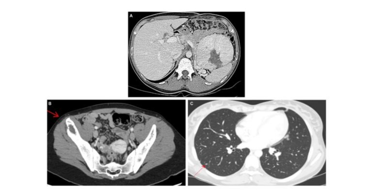 Figure 1: A CT total body base line revealed a primary renal lesion measuring 10 cm (A), a lytic lesion of the right iliac wing (B) and multiple pulmonary nodules (C).