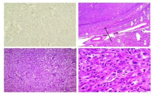 Figure 2: Histopathology of sRCC. No expression of the anti-SDHB antibody by tumor cells. Tumoral proliferation with diffuse architecture, eosinophilic cytoplasm, with atypical nuclei.