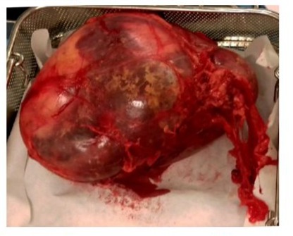 Figure 4: Large left nephrectomy, 11cm renal mass with hilar vascular invasions.