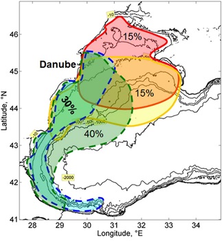 The most important feature of the north-western shelf of the Black Sea is the presence of estuarine areas of four major rivers (Danube, Dnieper, Dniester, Southern Bug), fresh discharge of them has a significant impact on the patio-temporal variability of the thermohaline structure. A dominant influence on the dynamics and thermohaline structure of waters (variability circulation, intrusion of river waters, upwelling, etc.) have a wind conditions under which water flow quickly adjust to wind flow. A long-term analysis of satellite images of the NWS region made it possible to assess the probability distribution of the freshwater runoff on the shelf. Depending on the wind conditions brackish water can spread east to Cape Tartan, and even to the Cape Chersonese, although more often they follow along the west coast to the Strait Bosporus, (Figure 1).