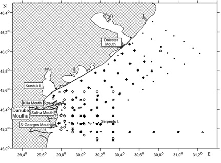Samples were collected during seven cruises of RV Trepang, Diorite, Whihr in the Ukrainian exclusive economic zones of the northwestern Black Sea, (Figure 2). Investigated parameters were dissolved oxygen, oxygen saturation and nutrients - phosphates (PO4), silica (SiO4), nitrates (NO3), nitrites (NO2). Surface and bottom water samples were collected with clean plastic bottles making use of a CTD-Seabird, equipped with a Niskin bottles mounted on a rosette frame. After sampling plastic bottles were immediately freeze at -18°C in RV freezer. After cruise (7-10 days) defrosted samples were filtered through 0,45 µm pore size filter Millipore in MHI analytical laboratory, inorganic nutrients (dissolved nitrates, nitrites. silica and phosphates) were determined following standard spectrophotometric methods, [19-20]. Dissolved oxygen was analyzed by standard Winkler titrations on board.