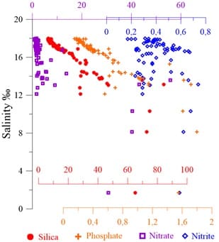 Figure 4: The distributions of silica, phosphate, nitrate, and nitrite, all in µM.