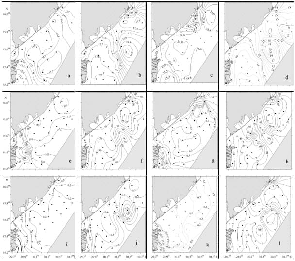 Figure 5: Distribution at the surface (a, c, e, g, i, k) and bottom (b, d, f, h, j, l) horizons in August 2009: salinity, % (a, b), temperature C° (c, d), oxygen saturation, % (e, f), concentrations of: silica (g, h), phosphates (i, j), nitrates (k, l), all in µM.