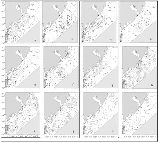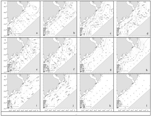 Distribution of streamflow in far east or northeast was fixed in two seasons: early winter at the beginning of December, 1998, and in summer, August, 2009. Run a detailed look at the features of "far" distribution of river streamflow for these two cases. Early in the winter of 1998, the "calm" situation of the winter distribution of hydrological and hydro chemical characteristics was fixed, Figure 3 a-l. Salinity increased smoothly as the distance from the Danube mouths, reaching 17% to 30.2° E, about 20 miles from the coast, Figure 3 a. Salinity of bottom waters near the mouths was much larger, 15‰ near the Selina mouth and 11% near St. Georges mouth. However, isohaline 175 in the bottom waters was situated a little further west than at the surface, approximately at 30° E. Just as smoothly, as the distance from coast increased temperature, vertical gradient became almost zero after reaching 6°C at the surface, approximately 10 miles from the coast. Once the salinity reaches 11-12%, relative density of surface and bottom waters became identical, but did not exceed σt =13.7 kg/m3 in all the investigated area. At the same time, the relative water density at shallow (depth of 11 m) station, located to north, opposite the Dniester mouth (30.82° N, 46° E) reached σt =14.0 kg/m3, i.e. there has already begun penetration of coastal cool water under the less dense water of the open part of the shelf.