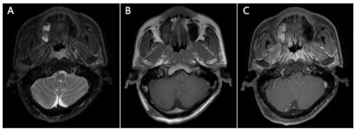 Figure 1: MRI scan showed an apparent contrast-enhancing soft tissue lesion in the nasopharynx involving bilateral staphylinus externus and petrostaphylinus (A) T2-weighted image of the lesion (B) T1-weighted image (C) contrast-enhanced T1-weighted image.