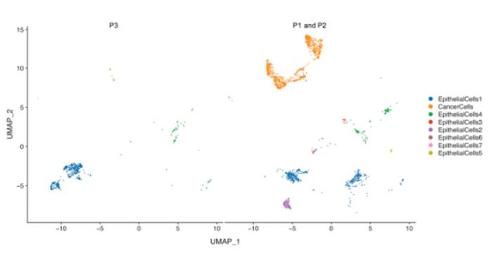 Figure 2: t-SNE plot of epithelial cells from the biopsy tissues of the current case (P3) and other two patients (P1 and P2) diagnosed as undifferentiated non-keratinizing carcinoma. The subtypes of epithelial cells are roughly consistent among patients.