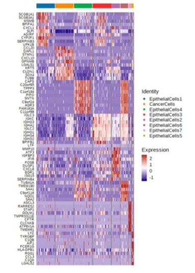 Figure 3: Heat map of differentially expressed genes (rows) in the eight clusters of epithelial cells from the three patients. The top ten genes overexpressed in each cluster are indicated.