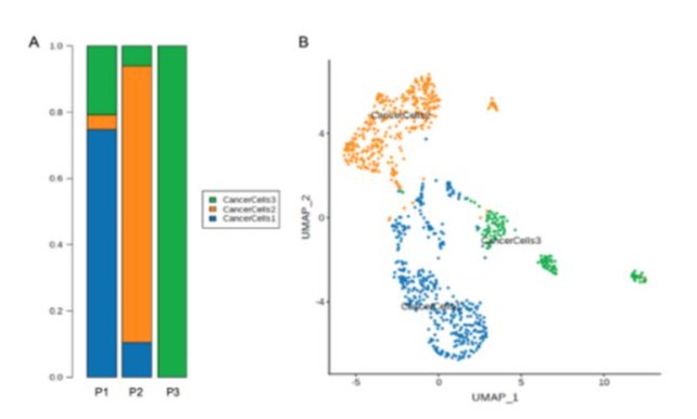 Figure 4: (A)The proportion and composition of tumor cell clusters among three patients. (B) Tumor cells can be classified into three clusters and are annotated as cancer cells 1, cancer cells 2 and cancer cells 3. All of the three clusters are identified from P1 and P2, while only cluster 3 is identified from the current case (P3).