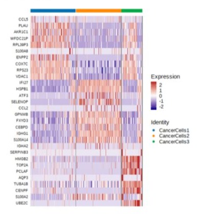 Figure 5: Heat map of differentially expressed genes (rows) in the three clusters of tumor cells. The three clusters of tumor cells have different individual expression patterns. The tumor cells identified from this case belong to the cluster of CancerCells 3.