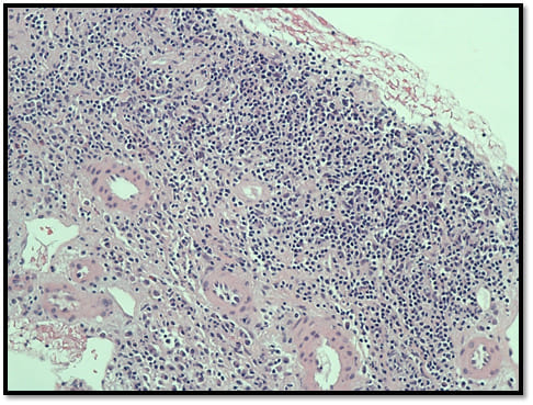 Image 1: Renal Allograft biopsy with lymphocyte, plasma cells and occasional eosinophil infiltration: Acute Rejection.