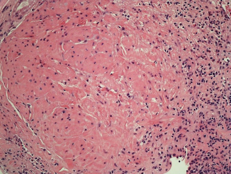 Image 2: Low-power view showing leiomyoma with whorls of cytologically bland spindle cells and prominent eosinophilic cytoplasm.
