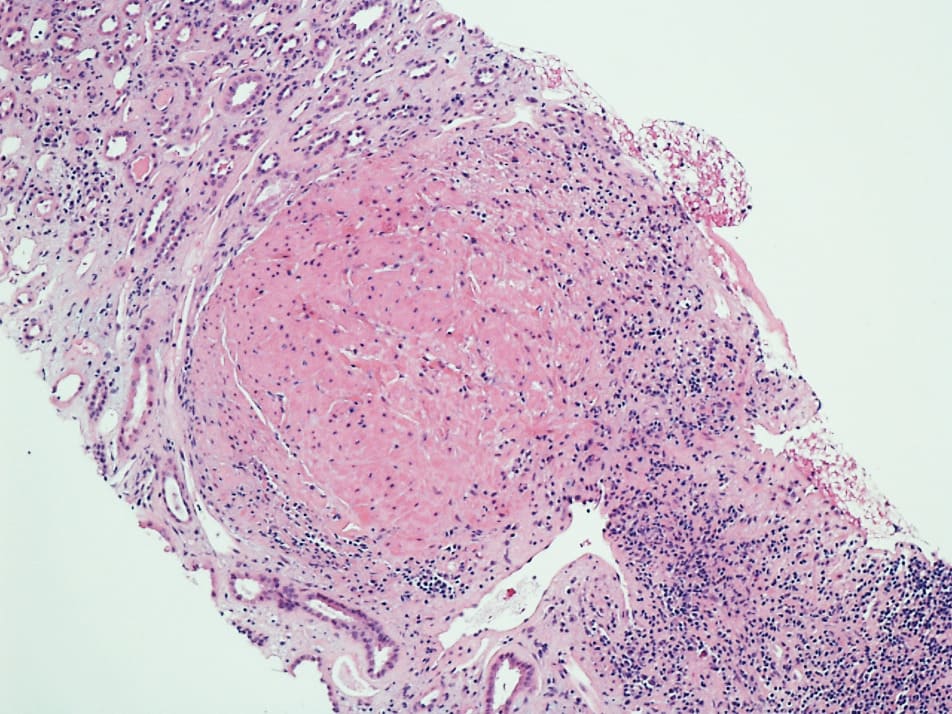 A 34-year-old lady with history of renal transplant four years ago presented with worsening left sided abdominal pain located at the site of her renal allograft. Initial laboratory works up showed a sharp decline in renal function with a creatinine of 5.78 mg/dl with an estimated Glomerular Filtration Rate (GFR) of 9ml/min. Pertinent positive findings on clinical assessment were high BP of 159/97 and significant lower extremity edema. Urine analysis was significant for mild proteinuria but no hematuria or signs of infection.