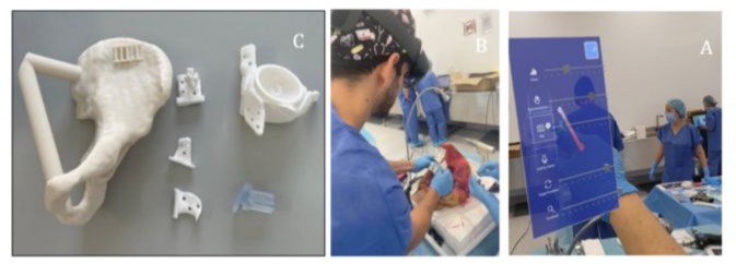 Figure 2: (A) Materials used in the study: Cadaveric hemipelvis bio model fabricated from acrylonitrile styrene acrylate (ASA); patient-specific cutting guides (PSIs) and custom-made prosthesis, both 3D printed in rigid radiopaque 10k resin, along with a removable AR marker socket designed for intraoperative tracking and alignment of the prosthesis. (B) Intraoperative image. (C) Custom-designed software interface integrated into the system, allowing the user to toggle visual elements (bone, target prosthesis, and actual prosthesis) and adjust transparency settings for improved visualisation. Images captured via the AR head-mounted display (HMD).