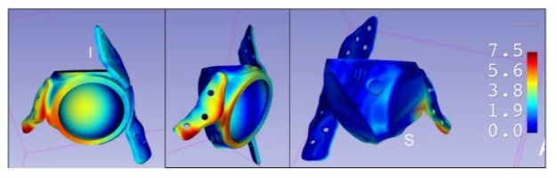 Figure 4: To facilitate interpretation and comparison across cases, a uniform colour scale was established with a fixed range from 0 mm (no error) to 7.5 mm (maximum represented deviation). This visualisation allows for rapid identification of areas with the greatest deviation and assessment of whether these affect regions critical to the implant’s stability or functionality.