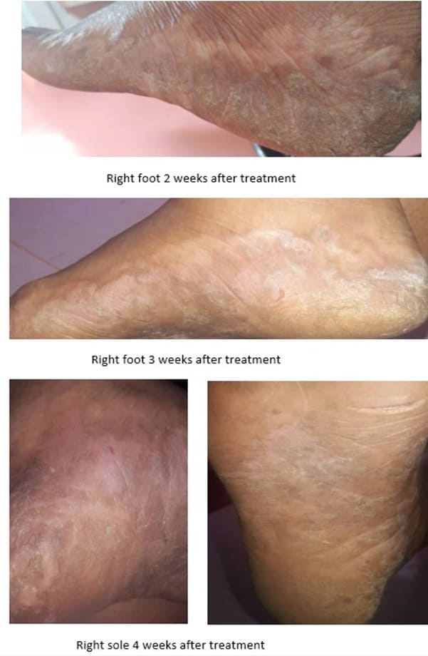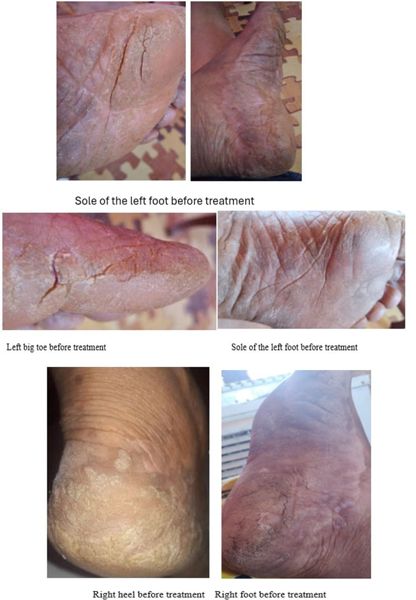 At second visit three months later, she presented with the same complaint, and examination of her feet revealed creases, erythema, and small cracks. The physician advised her to continue the same medications for an additional three months without conducting further investigations.